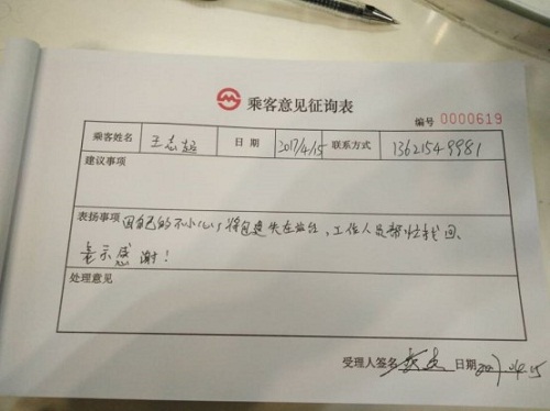 據了解,當天下午16點左右,花橋站員工在巡視站臺過程中發現有物品被遺失在站臺,當即通知值班站長進行尋找、播放失物招領廣播,并將物品登記、存放好。隨后,失主王先生返回車站尋找,車站員工熱情接待,與王先生核對物品無誤后交還于他,王先生對車站員工拾金不昧表達感謝。