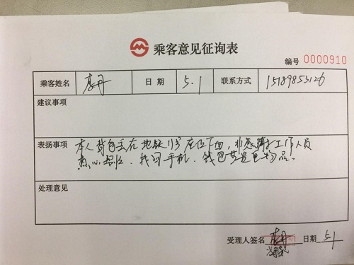 據(jù)了解,當天中午一點多的時候,乘客李女士不小心將背包遺失在列車座位下面,站臺下行站務(wù)員進行清客時發(fā)現(xiàn)遺留的背包并通知值班站長,值班站長隨即派工作人員將背包拿至站長室,與客運值班員共同清點包內(nèi)物品并且做好登記,在發(fā)現(xiàn)有乘客報失后立即與其取得聯(lián)系并通知其前來認領(lǐng)。李女士拿到遺失物品后對此表示十分感謝,并寫下了感謝信。