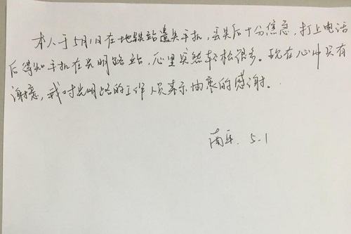 5月1日,軌道公司光明路站收到了一封來自乘客南平先生的感謝信。