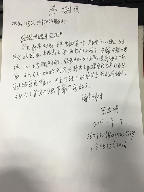 9月2日,兆豐路地鐵站收到一封來自乘客董蘇明的感謝信。