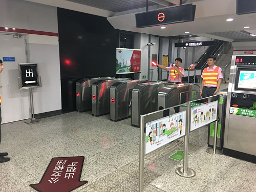 演練開始前,值班站長組織全員進(jìn)行桌面演習(xí),對(duì)車站可能出現(xiàn)擁堵情況的地點(diǎn)重點(diǎn)講解,班組成員根據(jù)預(yù)演安排正式開始。根據(jù)客流擁堵情況,關(guān)閉部分TVM及自動(dòng)扶梯,安排員工在電梯前引導(dǎo)乘客進(jìn)站;車站不間斷的利用廣播進(jìn)行引導(dǎo),在車站出入口設(shè)置一米欄及鐵馬進(jìn)行客流引導(dǎo),客服中心在閘機(jī)旁做好乘客解釋工作并發(fā)放致歉信。整個(gè)演練過程,貫徹了“統(tǒng)一指揮,逐級(jí)負(fù)責(zé)”原則,參與演練人員必須在演練工作小組的統(tǒng)一指揮下,經(jīng)各方參與力量對(duì)現(xiàn)場(chǎng)情況進(jìn)行處置。