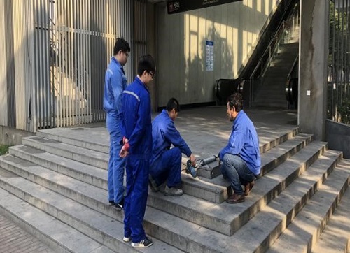 軌道公司對兆豐路站一號口樓梯臺階面進(jìn)行破損修復(fù)工作