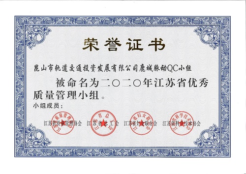 近日,昆山市軌道交通投資發展有限公司“鹿城脈動”QC小組被江蘇省質量管理協會授予“優秀質量管理小組”稱號。