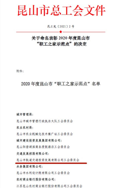 近日,昆山市總工會發布了《關于命名表彰2020年度昆山市“職工之家示范點”的決定》,昆山軌道公司工會委員會“職工之家”成功入選!