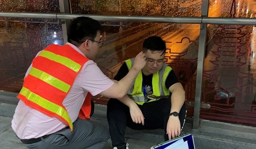 演練模擬高溫天氣下運營期間兆豐路站乘客在站廳中暑暈倒,客服中心發現后立即匯報值班站長,值班站長立即通知各崗位車站啟動非職工傷亡應急處置預案。值班站長至現場確認暈倒乘客情況并做好先期救助,落實事故現場安全防護。車控室值班員利用廣播做好乘客信息告知等宣傳工作,并將情況匯報公司應急指揮室,車站站長等??瓦\值班員做好目擊證人挽留工作及120救援人員接應工作。站務員做好圍觀乘客疏散及受影響乘客信息告知工作。