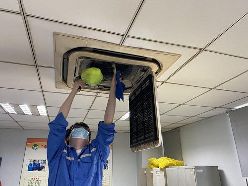 場地清空后,委外師傅將空調濾網從新風機內抽出,先將表面附著的臟東西掃掉,之后用清水對濾網清洗直到濾網干凈為止,再將洗干凈的濾網用稀釋過的84消毒水消毒,消毒后對清洗干凈的濾網進行晾曬。當濾網干后,檢查濾網是否清潔、表面有無污物和灰塵,濾網孔眼是否通透,無堵塞,確認沒有問題后再進行安裝。